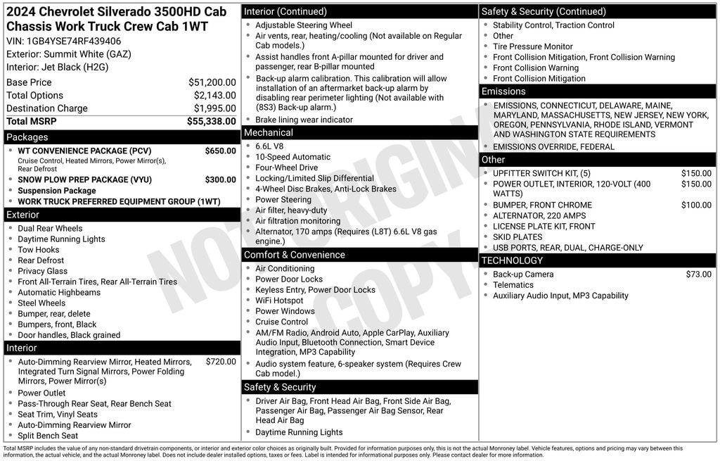 Our 2024 Chevrolet Silverado 3500 W/T Crew Cab 4X4 with the Convenience Pack in Summit White is a leading choice for long days and hard jobs! Powered by a 6.6 Liter V8 serving up 401hp matched to a 10 Speed Allison Automatic transmission tuned to help with towing and hauling. An auto-locking rear differential and 2-speed transfer case bring this Four Wheel Drive truck even more confident capability. It's easy to stand out with our Silverado's black bumpers, black beltline moldings, a trailer hitch, cargo-area lights, recovery hooks, rear/side bed steps, and our Convenience Pack for heated power trailer mirrors, tinted glass, and power lock/release EZ Lift tailgate.