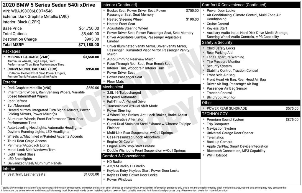 Dark Graphite Metallic 2020 BMW 5 Series 540i xDrive AWD 8-Speed Automatic 3.0L I6 Turbocharged DOHC 24V LEV3-ULEV70 335hp