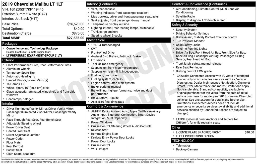 Designed for excellence, our **2019**Chevrolet**Malibu**LT**Sedan**Heated Seats**Apple CarPlay/Android Auto** gets off on the right track with its striking Summit White finish! Powered by a TurboCharged 1.5 Liter 4 Cylinder offering 160hp connected to an innovative CVT for peppy performance with responsible efficiency. This agile Front Wheel Drive sedan combines responsive steering and precisely tuned handling as it sees nearly 36mpg on the highway. Sculpted and upscale, the carefully honed shape of our Malibu is set off by LED lighting, heated power mirrors, and 17-inch alloy wheels. It's a head-turning combination of features that will get your attention and everyone else's!Check out the cabin of our LT, and you'll discover high details like premium-cloth heated front seats, eight-way power for the driver, a multifunction steering wheel, dual-zone automatic climate control, and keyless open and start. To meet your need for digital convenience, rely on the 8-inch touchscreen, Android Auto®, Apple CarPlay®, Bluetooth®, WiFi compatibility, and a six-speaker audio system that serves up superior sound.Your safety is imperative at Chevrolet. You're protected on your journeys by a backup camera, ABS, tire-pressure monitoring, StabiliTrak stability control technology, the Teen Driver system, and ten airbags for optimum coverage. Our Malibu LT sedan makes driving better! Save this Page and Call for Availability. We Know You Will Enjoy Your Gregg Young Chevrolet Omaha Test Drive Towards Ownership! We offer PRE-APPROVAL programs so call (402) 572-8080 to get started today! At Gregg Young Chevrolet... We'll Go The Extra Mile For You. We have an app for that! Download the Gregg Young Chevrolet application directly to your iPhone or Android.