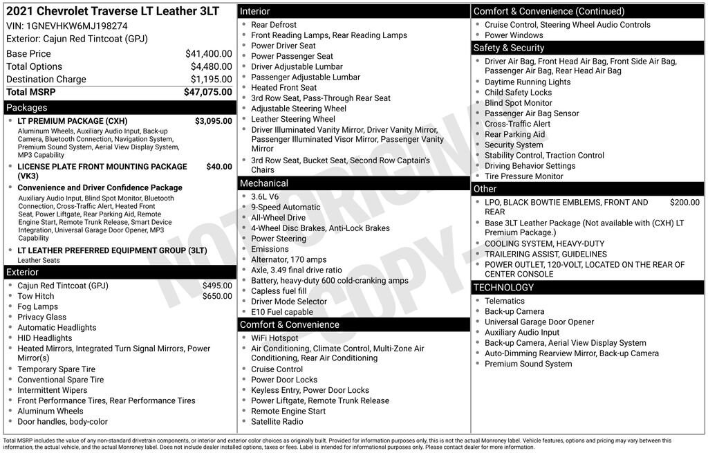 **Accident Free**2021**Chevrolet**Traverse**LT**AWD**Navigation**Power Liftgate**Remote Start**Heated Seats**Our upscale Accident Free 2021 Chevrolet Traverse LT Leather AWD with the Premium Pack treats bigger families to better accommodations and a bold Cajun Red Tintcoat design! Driven by a robust 3.6 Liter V6 offering 310hp tethered to a 9 Speed Automatic transmission for excellent everyday capability. This All Wheel Drive SUV also delivers responsive handling and is great for road trips, running the kids to school, and even just going to work, and it achieves nearly 25mpg on the highway. Standing strong and proud, our Traverse rewards you with HID headlamps, fog lights, roof rails, dual-exhaust outlets, alloy wheels, and a power-programmable tailgate.Our LT Leather premium cabin fits seven people and lives up to its name with comfortable leather heated power front seats, second-row captain's chairs, a leather-wrapped steering wheel, tri-zone automatic climate control, cruise control, and Chevrolet Infotainment 3 technology. It's a smart setup that combines an 8-inch touchscreen, navigation, voice recognition, WiFi compatibility, Apple CarPlay, Android Auto, Bluetooth, and a six-speaker sound system for easy connections and digital convenience.Chevrolet's sophisticated approach to family safety shows a rearview camera, blind-spot monitoring, lane-change alert, rear parking sensors, ABS, and many smart airbags. You'll make the most out of every trip in our terrific Traverse LT Leather! Save this Page and Call for Availability. We Know You Will Enjoy Your Gregg Young Chevrolet Omaha Test Drive Towards Ownership! We offer PRE-APPROVAL programs so call (402) 572-8080 to get started today! At Gregg Young Chevrolet... We'll Go The Extra Mile For You. We have an app for that! Download the Gregg Young Chevrolet application directly to your iPhone or Android.
