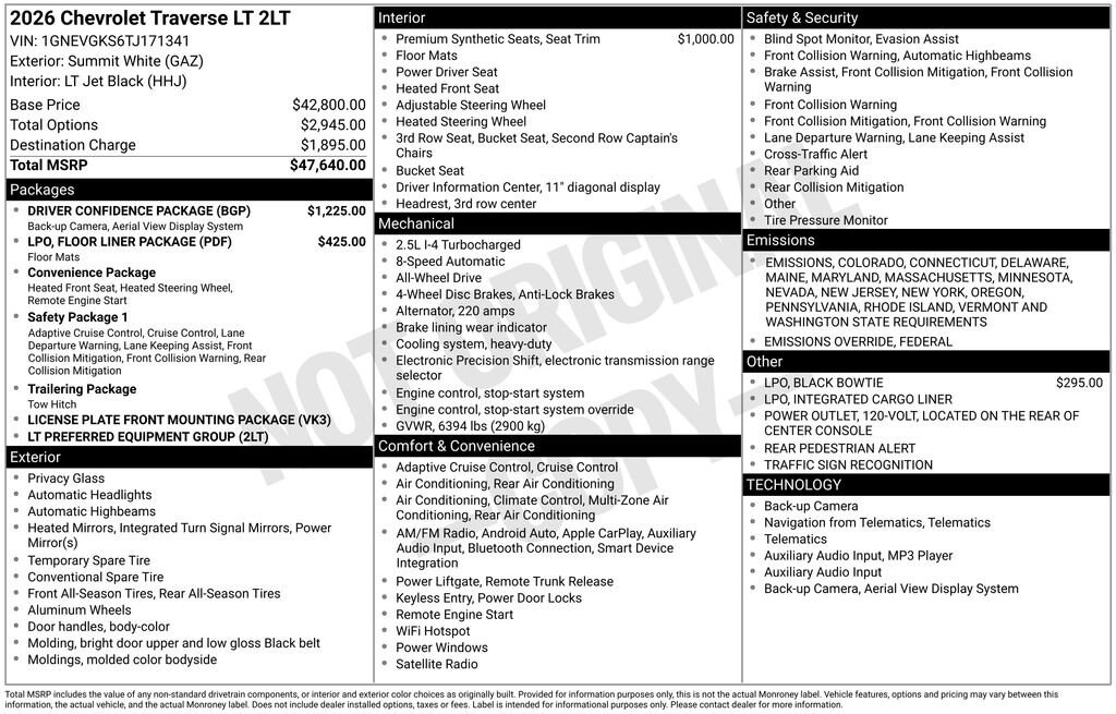 With premium touches and practical versatility, our **One Owner**Accident Free**2026**Chevrolet**Traverse**LT**AWD**Navigation**Heated Steering Wheel** in Summit White offers the perfect mix of comfort, technology, and capability for busy families on the go. Motivated by a TurboCharged 2.5 Liter 4 Cylinder supplying 328hp to an 8 Speed Automatic transmission. With that on board, you can enjoy strength to spare in an All Wheel Drive SUV that achieves nearly 27mpg on the highway with rugged good looks. Our Traverse helps explore your world with smart features like a hands-free liftgate, LED lighting, roof rails, alloy wheels, and heated power mirrors with built-in turn signals.