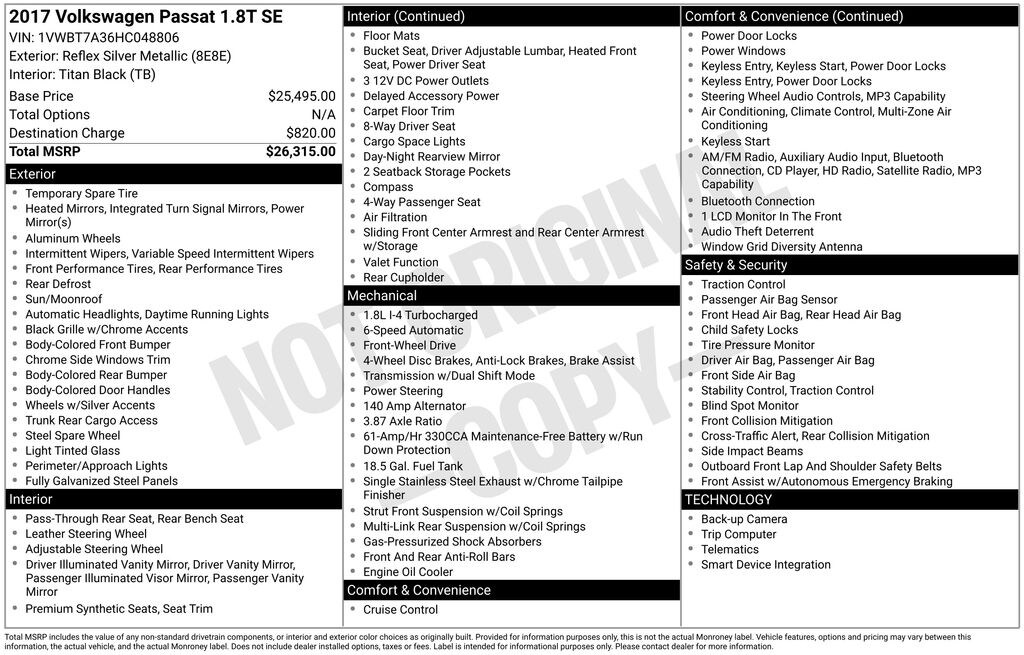 Imagine yourself climbing into the elegant cabin of the Passat SE, greeting you with everything you need for a comfortable ride. Settle into the heated leatherette driver's seat and acquaint yourself with generous amenities, including remote start, push-button start, a sunroof, dual-zone automatic climate control, rain-sensing windshield wipers, and 60/40 split-folding rear seat. Find your favorite song on the touchscreen sound system with a proximity sensor, CD/AM/FM/HD radio, and available satellite radio. Staying safely connected is simple with Bluetooth®, VW Car-Net connected car suite, and Car-Net App-Connect that lets you use apps from your smartphone right on your dash!